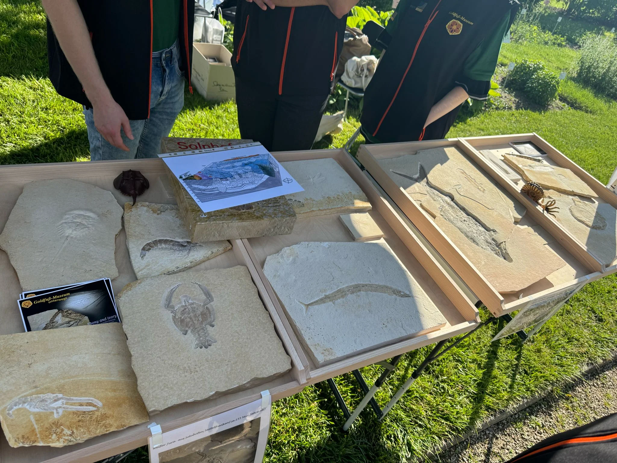 Ausgewählte Fossilien aus dem Solnhofener Plattenkalk: links sind einige krebsähnliche Gliederfüßer zu sehen, rechts einige Fische